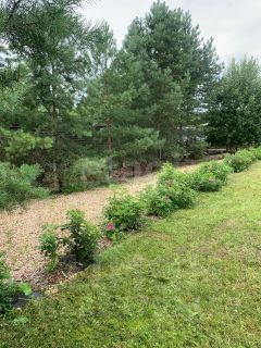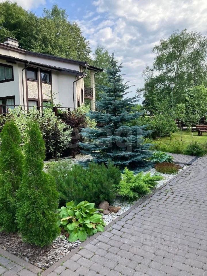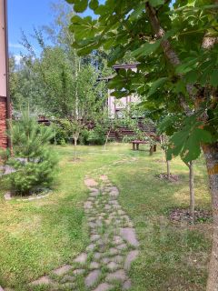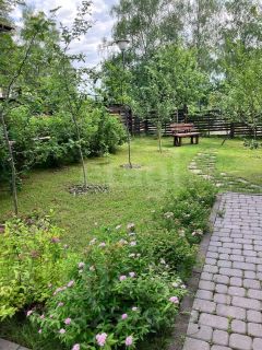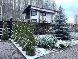 На участке хвойные и плодовые деревья, альпийская горка, ландшафтный дизайн, парковка на 2 машины.