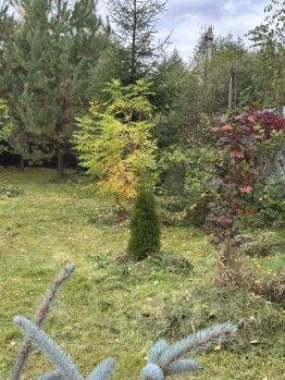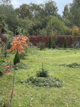по периметру , с северной стороны высажены сосны (уже большие) и ели (пока маленькие)
