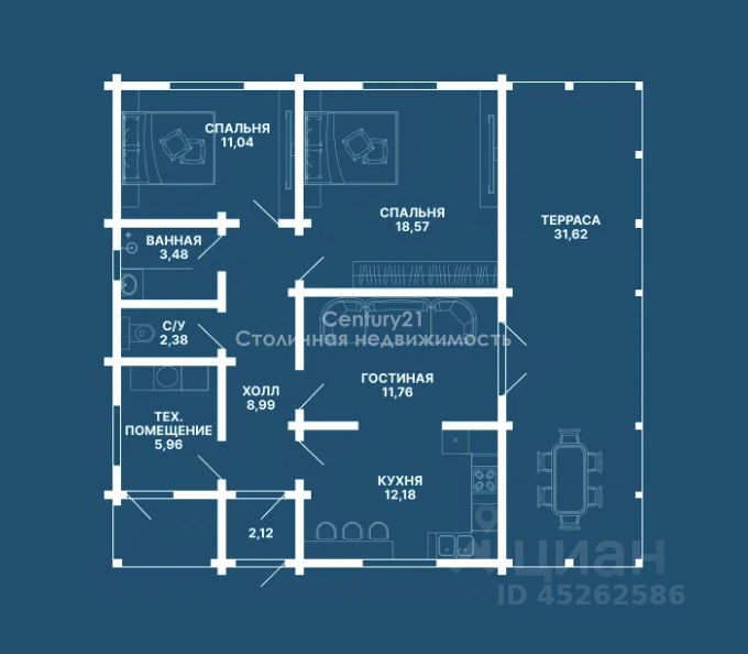 Структура комнат: кухня-гостиная, 3 спальни позволят организовать отдых для большой семьи с детьми, раздельный сан.узел и душевая.