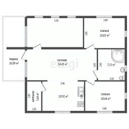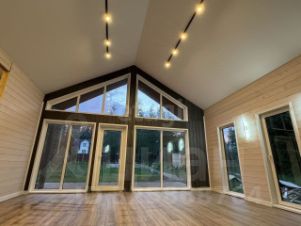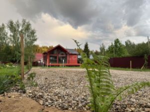 Планировка включает две спальни, просторную гостиную, большую кухню и мансардный этаж площадью 17 кв. м. Высокие потолки (5 м) и панорамные энергоэффективные окна от REHAU создают ощущение простора и наполняют дом естественным светом. Все коммуникации подключены: электричество (15 кВт), вода из собственной скважины, канализация — септик на 5-6 человек. Дополнительные преимущества — теплые полы, продуманная разводка электрики и качественная внутренняя отделка имитацией бруса с заводской покраской.