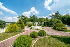 - Элементы ландшафтного дизайна: каменный фонтан, пергола, садовые лавочки.