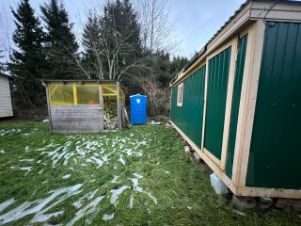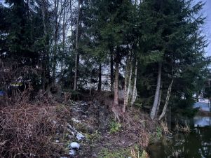 Участок засыпан черноземом, постелен геотекстиль. На участке 4 яблони,ели.