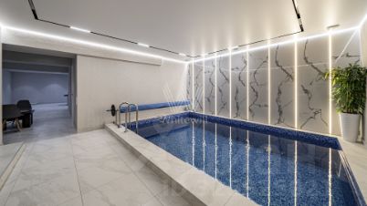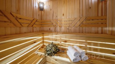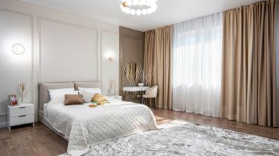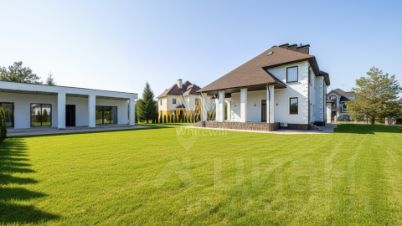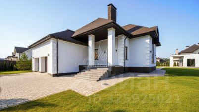 Крона. Загородный дом площадью 550 м² расположен на полевом участке 20 соток. Лаконичный фасад здания облицован бело-серой штукатуркой и декорирован подсветкой. Интерьер выдержан в современном стиле, оформлен в светлых оттенках в сочетании с фактурой дерева и камня. В резиденции разместили 4 спальни, просторную гостиную с камином и вторым светом, кухню-столовую и спа-зону с бассейном и сауной. В контуре дома предусмотрен гараж на 2 машины.