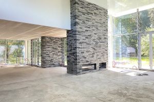 В цокольном уровне разместились апартаменты для персонала, кухня, домашний кинотеатр и техническое помещение для бассейна и котельная.