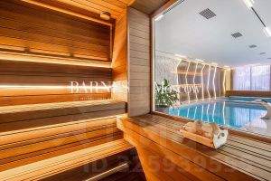 1 этаж: холл, большая гардеробная, постирочная, кухня, столовая с выходом на открытую веранду с дровяным камином-барбекю, гостиная с паровым камином, кабинет, гостевой санузел, котельная, гостевая спальня, спа-зона 200 кв.м.: 3 душевых с обливным ведром, санузел, хамам с звездным небом, сауна с стеклом в бассейн, плавательный бассейн 10 на 5 м , зона отдыха с шезлонгами тв и мягкой группой мебели с выходом на террасу;