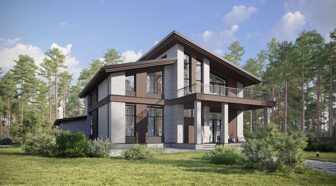 Двухэтажный дом в стиле Шале, площадью 342 м², расположенный на участке 22 соток