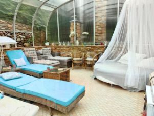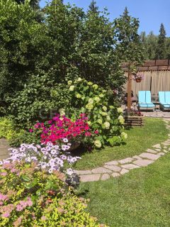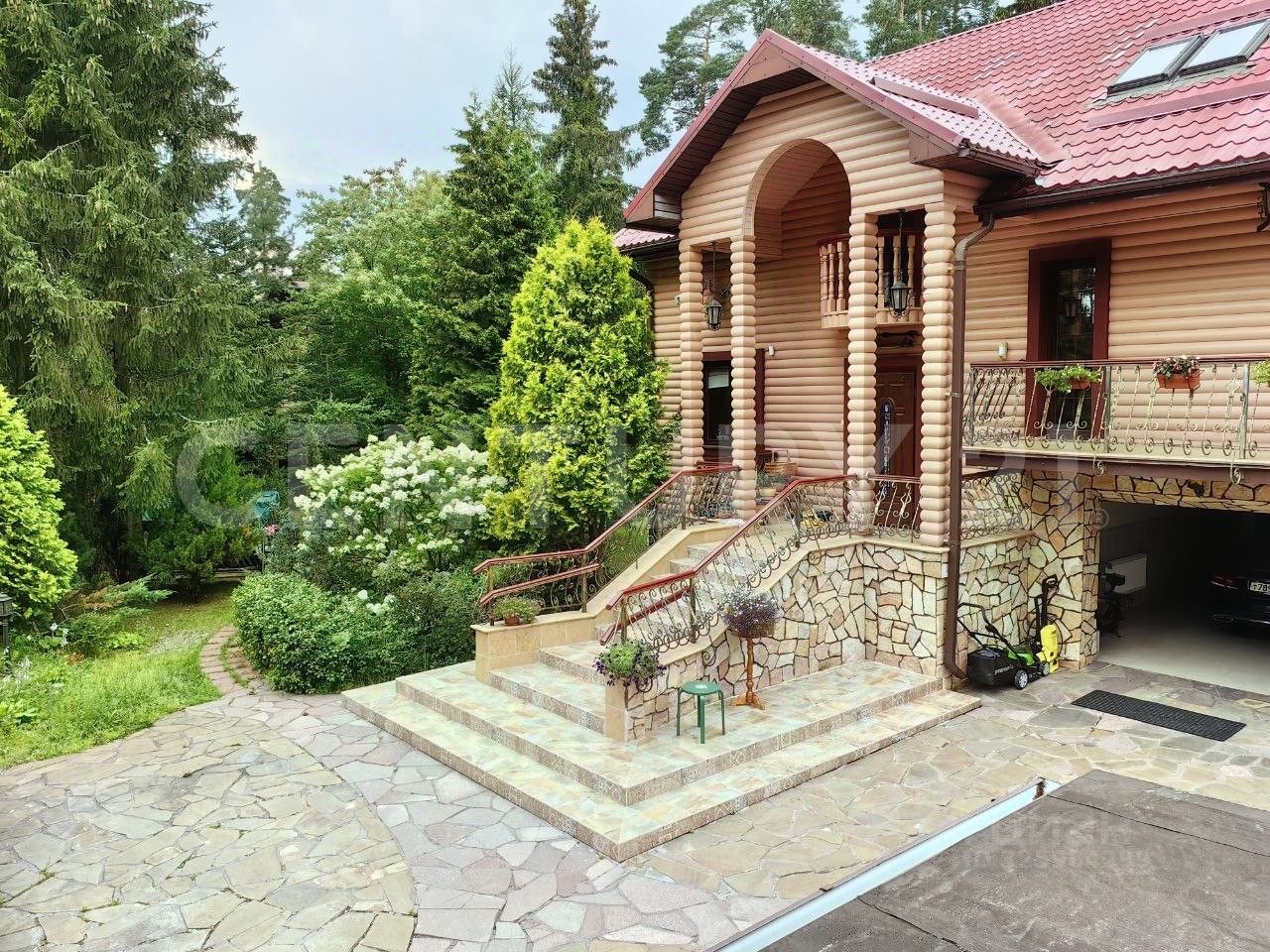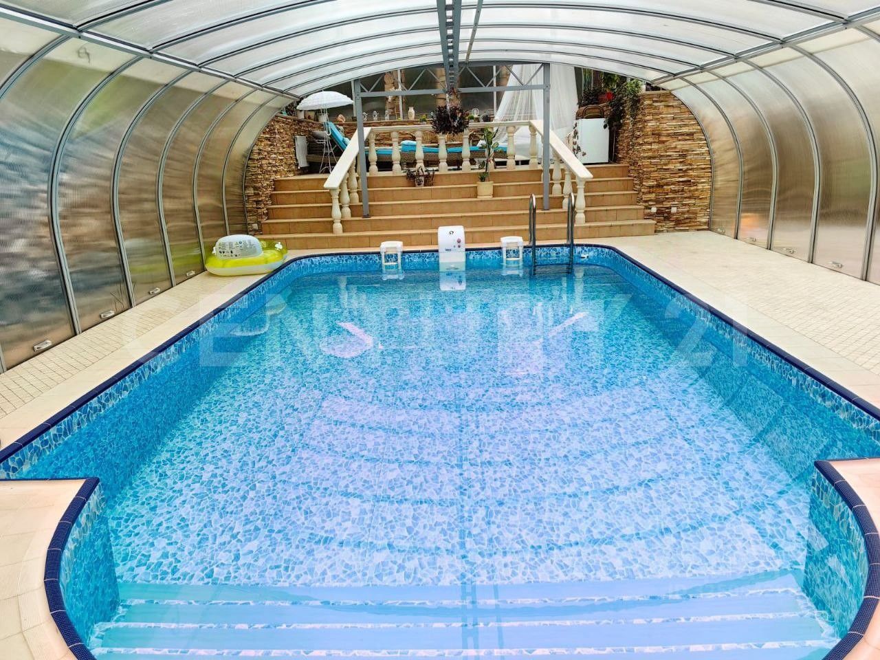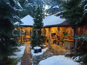 Крытый круглогодичный бассейн с зоной отдыха, пергола для летнего отдыха, отдельная беседка, зона барбекю, дровница, летняя кухня с тандыром, детская площадка. На территории также расположен гостевой дом с верандой, спальней и санузлом. Участок огорожен, установлены автоматические ворота, На участке растут грибы, по территории живут белочки.