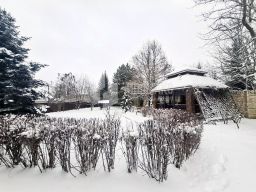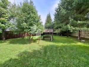 Участок просторный, полностью огороженный, есть площадка для парковки автомобилей и тёплый гараж для двух авто. Дополнительно — полностью оборудованная квартира для персонала (спальня, кухня, санузел) находится над гаражом. Закрытая беседка-барбекю с мангалом. На участке шикарный яблоневый сад, лесные деревья, декоративный ручей, ландшафтный дизайн, садовые качели.
