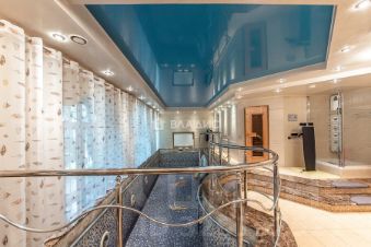 Первый этаж: зимний сад 40 кв.м, бильярдная 30 кв.м, тренажерная 27 кв.м, гостевая комната, СПА с сауной и бассейном с противотоком, санузел, технические помещения (котельная, постирочная, кладовые).