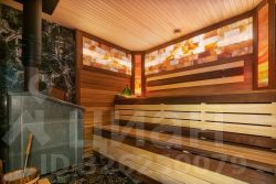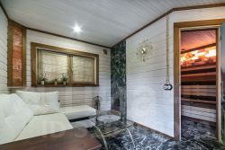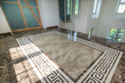 Внутри выполнена предчистовая отделка: полы испанский мрамор и инженерная доска (дуб); подоконники испанский мрамор; стены оштукатурены; выполнены разводка электричества и коммуникации, все с/у укомплектованы импортной сантехникой. Котельная под ключ котел Viessmann(100 кВт), бойлер на 300 л. Теплые полы первый этаж и все с/у.