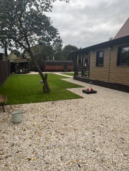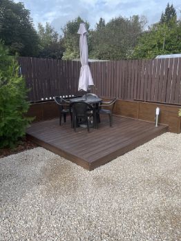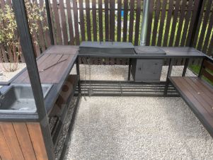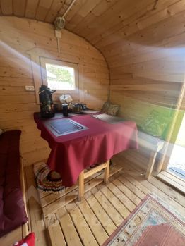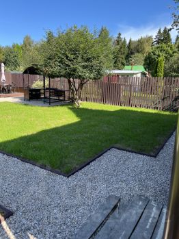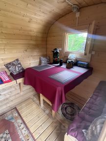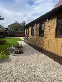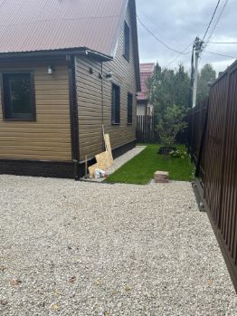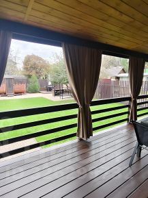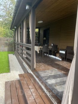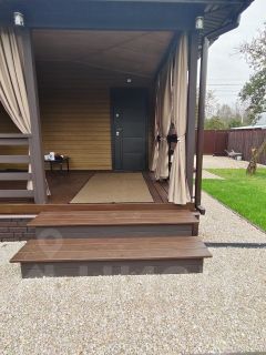 На территории участка площадью 550 квадратных метров расположена баня Квадро бочка 6х2,2, Также имеется открытая терраса с обеденным столом, где можно наслаждаться природой и теплыми вечерами.