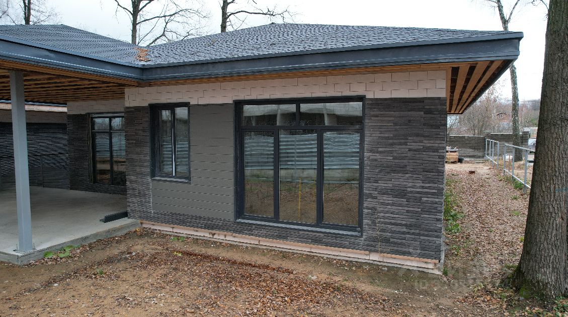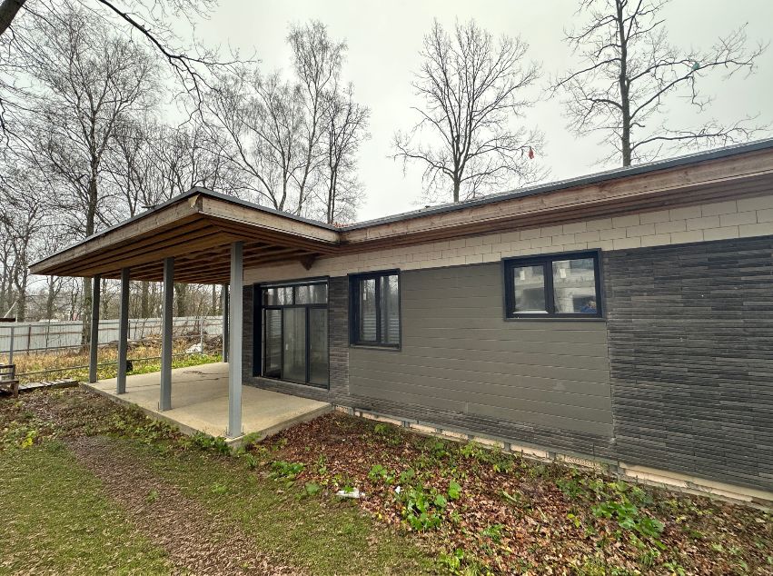 Дом с готовой внешней отделкой, тремя спальнями, просторной кухней-гостиной и собственным гаражом ( можно переоборудовать под желую комнату). Фундамент — плита 300 мм, мягкая кровля с утеплением, окна Rehau. Планировка функциональная, есть выход на террасу 30.52 м2.