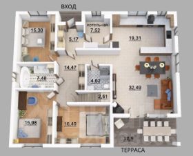 - Терраса 15м2 под крышей, можно поставить стол на 8-10 человек