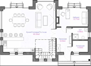 Функциональная планировка - 4 спальни, одна из которых на первом этаже, большая кухня-гостиная с большими окнами.