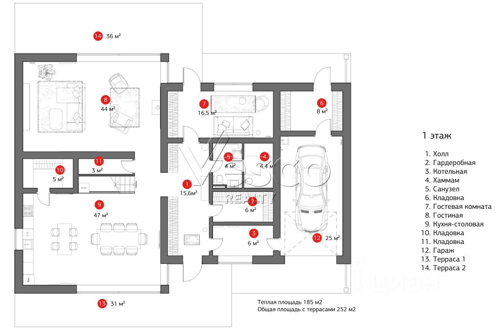 1 этаж: гостиная, кухня-столовая с кладовой, гостевая комната/кабинет с выходом на террасу, холл, с/у с хаммамом, гардеробная, котельная, гараж;