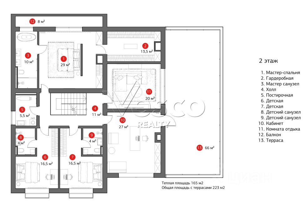 2 этаж: мастер-спальня с ванной комнатой, гардеробной и балконом, 2 спальни с с/у, кабинет с выходом на террасу, постирочная, комната свободного назначения.