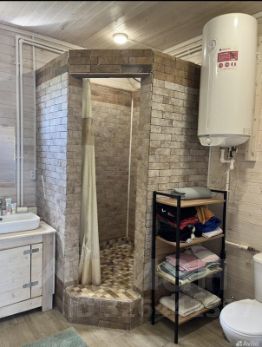 На первом этаже: кухня гостиная 20кв, парная 7,4кв и душевая с туалетом 8,5. В гостиной теплые полы, электр батареи. Кухня с встроенной посудомоечной машиной. Вся техника (холодильник, стиральная машина, посудомоечная, нагреватель на 100л) остается новым хозяевам. Дорогая качественная чугунная печка Везувий.