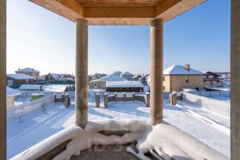 Все стены дома оштукатурены, на 1 и 2 этажах выполнена стяжка пола (1-й этаж с подогревом), установлены панорамные окна и французские двери.