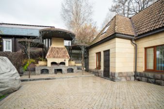 Дом облицован долговечными материалами - цоколь и фонтан выполнены из базальта, натурального камня темных природных оттенков. Фасад в более светлых тонах и облицован ферзитом, натуральным камнем, близким по своим свойствам к граниту. Кровля керамическая черепица производство Италия.