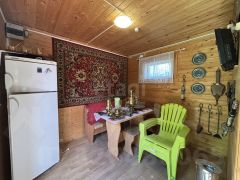 Гостевой дом с верандой (70,7 м²): Одноэтажный гостевой дом с просторной открытой верандой также готов принять вас и ваших близких. Он имеет электрическое отопление, горячее и холодное водоснабжение. К вашим услугам дровяная сауна, душевая, туалет и три комнаты, полностью меблированные и оснащенные техникой.