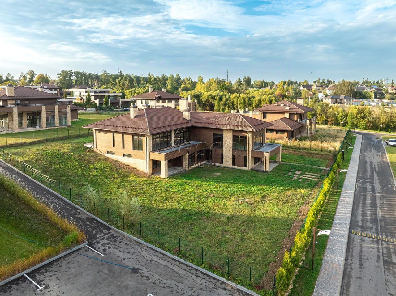 Дом расположен в центре поселка, на возвышенности. Из окон и с террас открываются живописные виды на водонапорную башню.