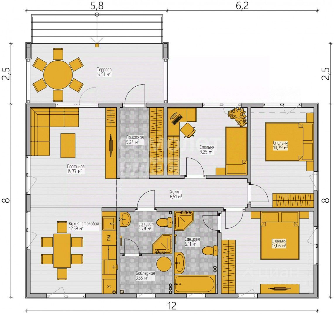 Планировка включает в себя две спальни, два санузла, большую прихожую, бойлерную, просторную кухню, а также гостиную с выходом на террасу. Большая терраса площадью почти 15 кв м. Строительство каркасного дома Алма выполняется из строганой древесины камерной сушки, даже стропильная система и перекрытия выполняются именно из нее. Если вы хотите изменить планировки, то наш архитектор поможет это сделать на первой же встрече.