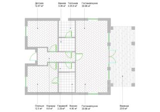 Общая площадь: 107.3 м2 (83.7 м2 дом + 23.6 м2 теплая застекленная веранда)