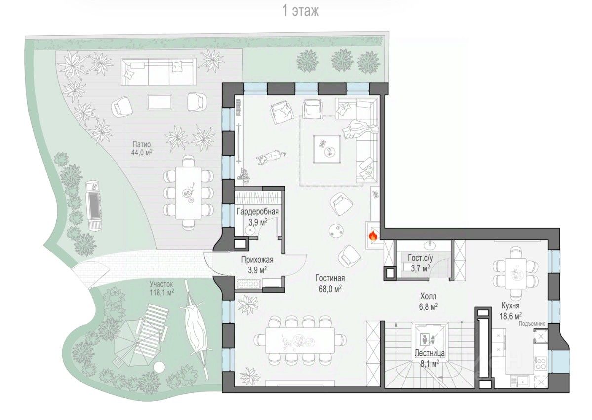 Частное патио позволяет создать палисадник, мини-сад, детскую игровую или тихую зону для отдыха. Прямой выход в подземный паркинг обеспечивает дополнительный комфорт. Жителям виллы доступна вся инфраструктура и премиальные сервисы дома "Лаврушинский", включая Clubhouse: фитнес с 25-метровым бассейном и спа, пространства для отдыха и продуманную детскую инфраструктуру.