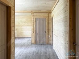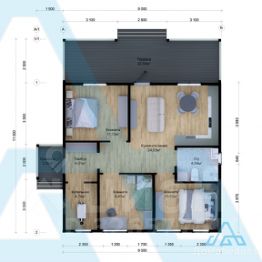 В доме кухня-гостиная площадью 24 кв. м с выходом на террасу 22 кв. м, три комнаты 9 кв. м, 10 кв. м и 11 кв. м, а также санузел, техническое помещение, холл и тамбур.