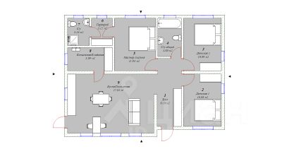 Три спальни одна из них мастер-спальня со своим гардеробом и своим санузлом, просторный общий санузел, котельная, кухонная кладовая и большая кухня гостиная, много больших окон, очень светлый, два входа.
