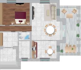 Планировка предполагает: 3 спальни (16,9 кв.м, 10,93 кв. м и 10,62 кв.м), 2 санузла (4,3 кв.м и 2,56 кв.м), гостиную (27,17 кв.м), кухню (8,0 кв.м), тамбур (8,38 кв.м), холл (3,0 кв.м), бойлерную (5 кв.м), веранду (33,5 кв.м) Высота потолков - 3,17 м. В стоимость дома также входит бетонная подготовка под парковки и дорожки.