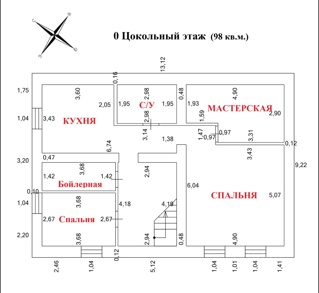 Цокольный этаж (98 кв.м.) - кухня, 2 спальни, мастерская, санузел, бойлерная.