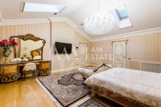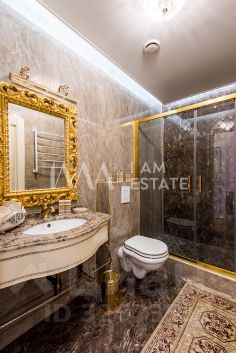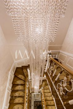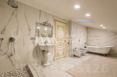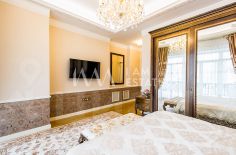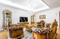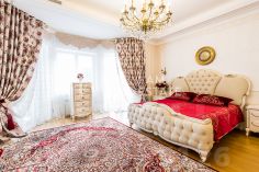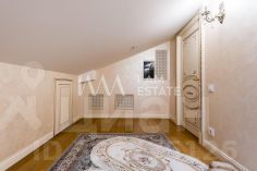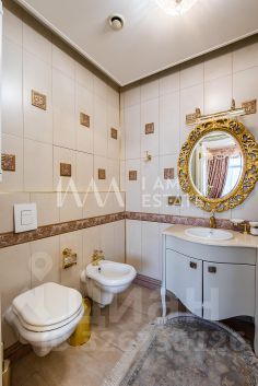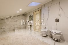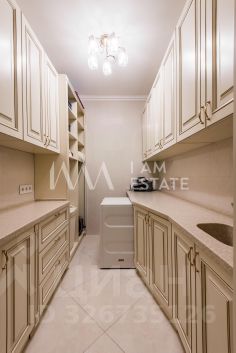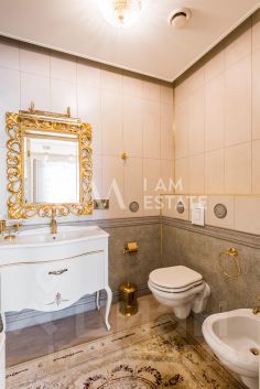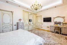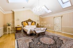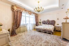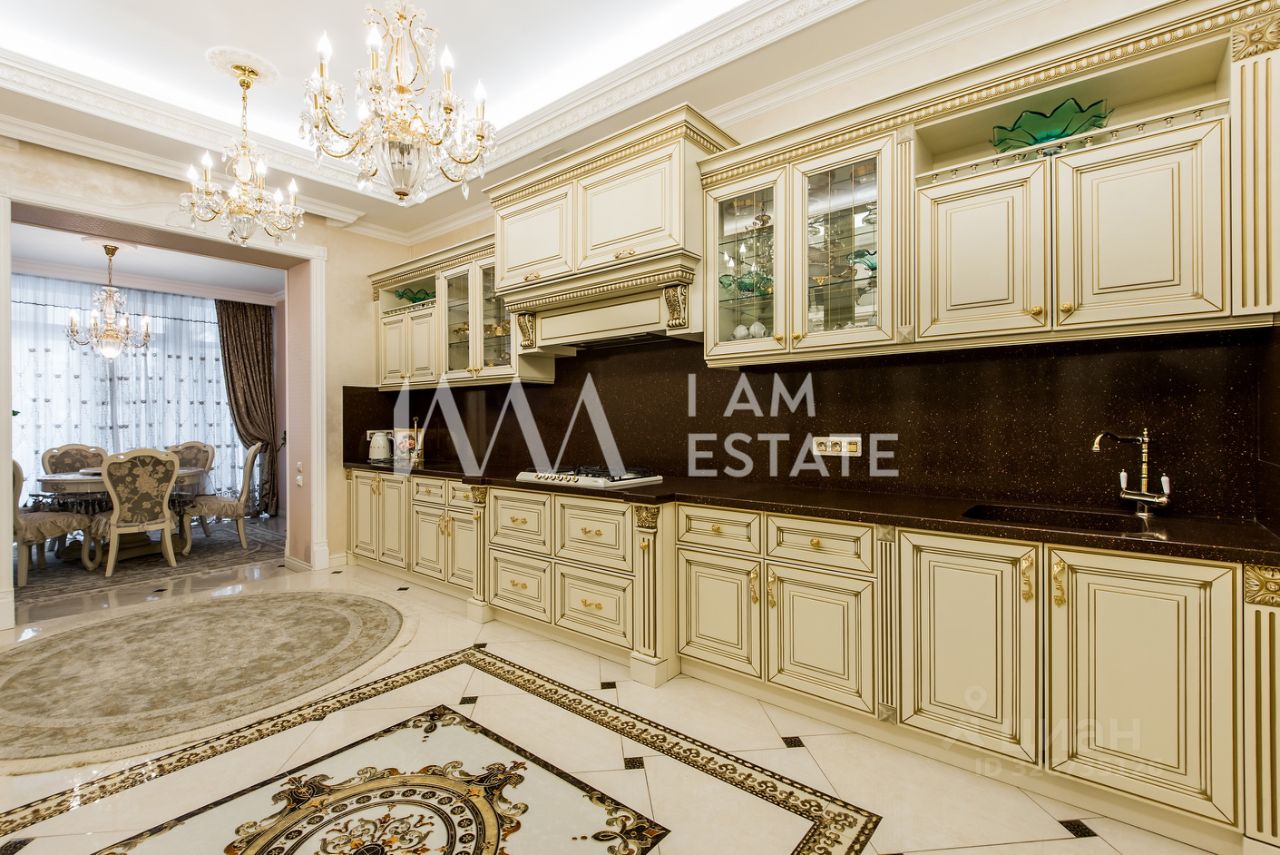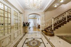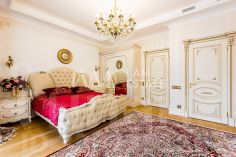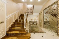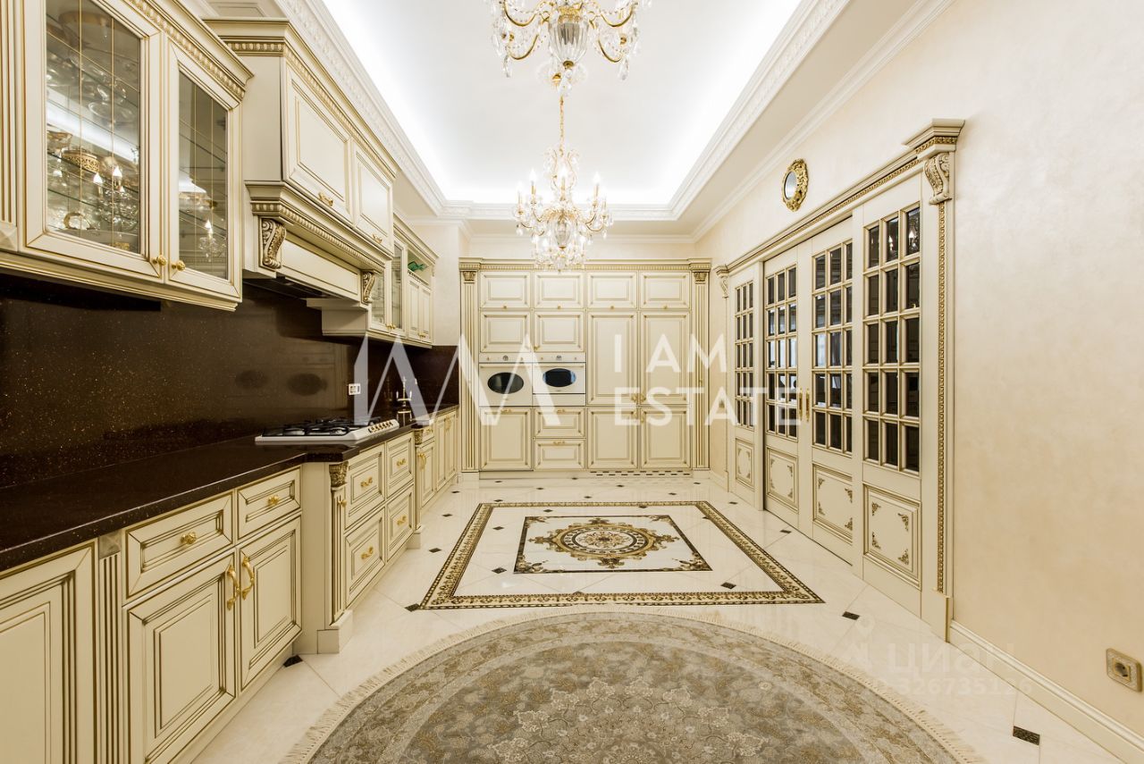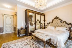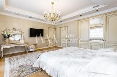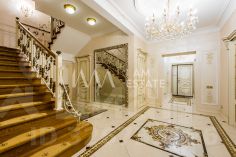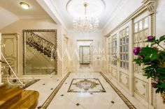 Интерьеры выполнены с использованием высококачественных материалов: кухня с дорогой мебелью и бытовой техникой ведущих производителей, гостиная с изысканной мебелью и панорамными окнами, спальни с уютной обстановкой, гардеробные комнаты, постирочная, ванные комнаты с качественной сантехникой иностранного производства Просторные помещения, продуманная планировка и роскошная отделка создают атмосферу комфорта и стиля.
