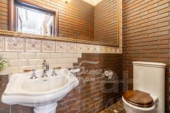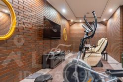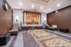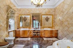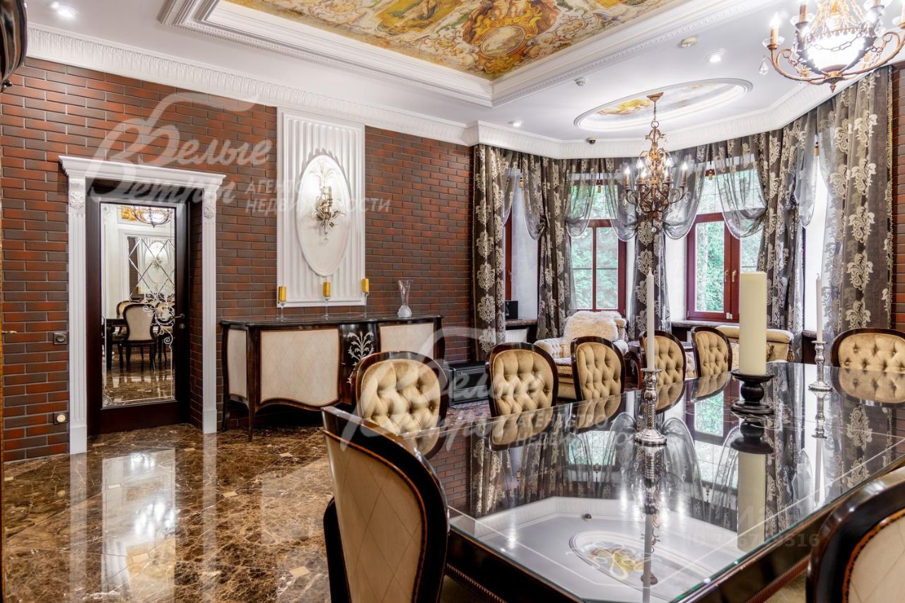 Описание внутренней отделки: роскошная отделка в классическом стиле выполнена по индивидуальному дизайн-проекту одного из пяти ведущих дизайнеров России с обширным применением натурального мрамора и декоративной гипсовой лепнины. В оформлении стен преобладает клинкерная плитка под кирпич (общая площадь плитки 1500 кв.м) с декором из гипса по индивидуальным эскизам, выполненным на месте работ (узорчатые панно, карнизы, полуколонны и другие элементы). В спальнях (кроме мастер-спальни) шелковые обои (Франция). В санузлах плитка (в санузле при мастер-спальне оникс). На полу в общих зонах мрамор (Emperador Dark, общая площадь 400 кв.м) с водяным подогревом, в спальнях доска из морёного дуба. Потолки многоуровневые с широкими гипсовыми карнизами. Установлены межкомнатные двери из массива дуба, часть из них со вставками из зеркал (производство Новый интерьер), дорогостоящая входная дверь, мраморные подоконники (Emperador Dark). Системы освещения, включающие розетки под люстры и точечные светильники, создают эстетичное обрамление для фресок на античные сюжеты. На второй этаж ведёт железобетонная лестница со ступенями, отделанными мрамором (Emperador White), перилами художественной ковки, поручнями из массива дуба, декоративная отделка нижней части лестничного марша выполнена с использованием гипсовых элементов, изготовленных по авторским эскизам на объекте. Гостиную украшает двухсторонний камин гильотинного типа, облицованный мрамором двух видов. В спа-зоне чаша бассейна отделана мозаикой, в парной канадский кедр..