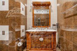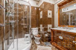 Мебель, оборудование: на кухне гарнитур с фасадами из дерева, мраморной столешницей (производитель GIORGIO PIOTTO, Италия), встроенная техника: холодильники Kuppersbusch, газовая плита AEG (Electrolux), посудомоечная машина Electrolux, шкаф с техникой - Kuppersbusch (кофемашина, СВЧ-печь, пароварка, духовой и винный шкаф). В столовой мебель из массива дерева с тканевыми вставками BRUNO ZAMPA, Италия. В гостиной и спальнях диваны, кресла, кровати из массива дерева с тканевыми вставками CEPPI, Италия. В спальных гарнитурах элементы из натуральной кожи CEPPI и PREGNO, Италия. Интерьер дополнен эксклюзивными итальянскими шкафами, столами, тумбами (PREGNO, GIORGIO PIOTTO, PREGNO, DANTI). В гостиной (второй свет) большая хрустальная люстра с металлическими элементами (IF JENY), в других помещениях люстры из металла, хрусталя, стекла, оникса (IF JENY). Помещения декорированы авторскими шторами российского производства (индивидуальный пошив) из микровелюра, тюля, жаккарда и гобелена. В санузлах - сантехника ведущих брендов: JACOB DELAFON, GLOBO, NICOLAZZI (Италия).