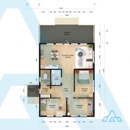 В доме кухня-гостиная площадью 34 кв. м с выходом на террасу 26 кв. м, три комнаты 12 кв. м, 12 кв. м и 14 кв. м, а также санузел, техническое помещение, холл и тамбур.