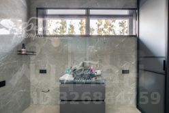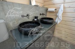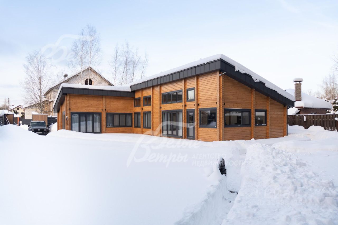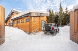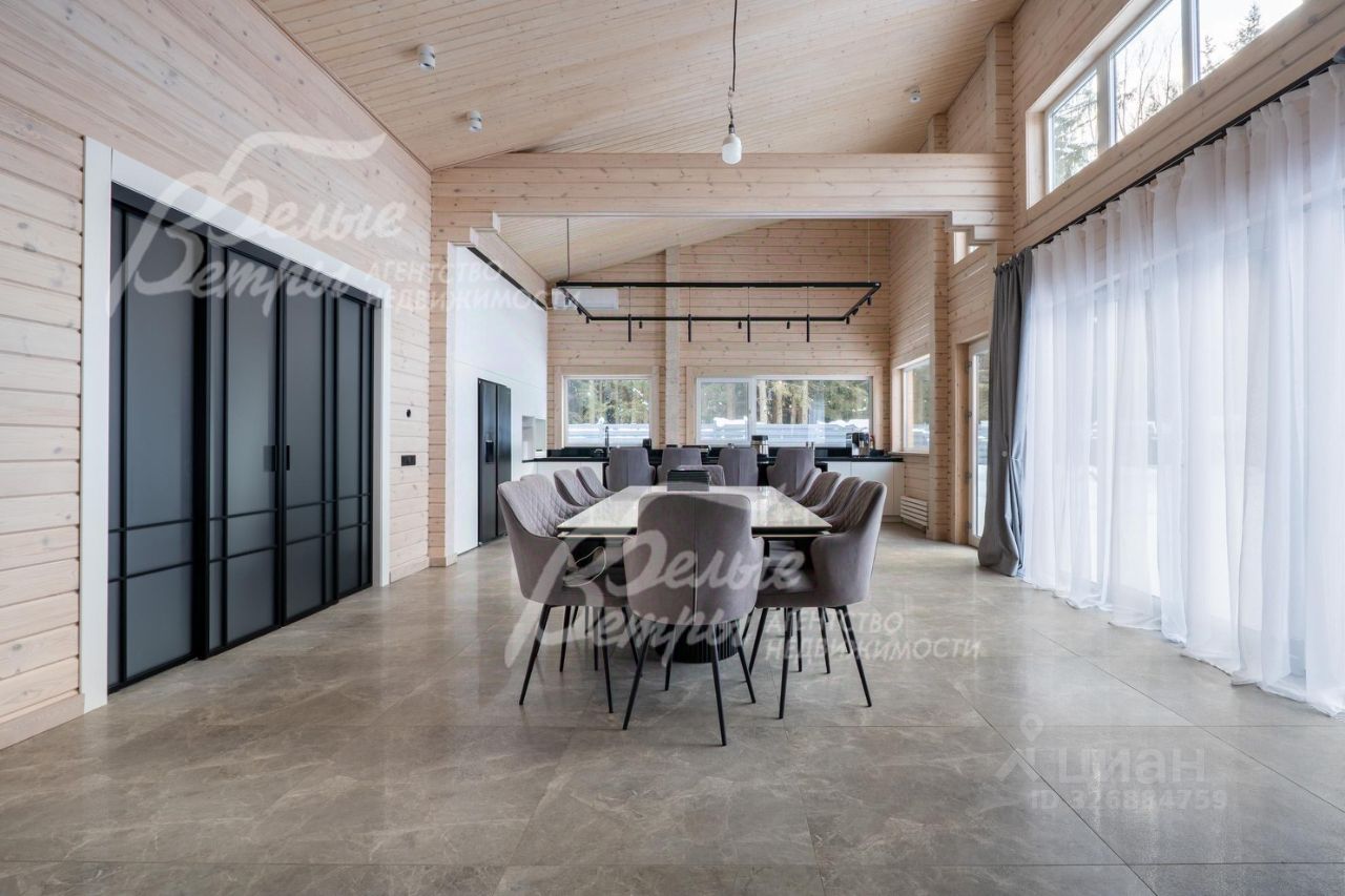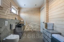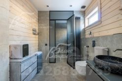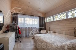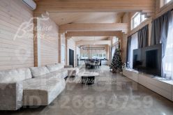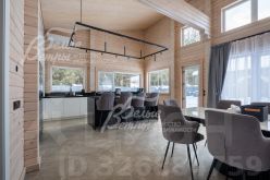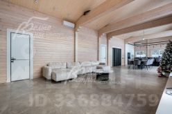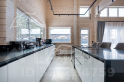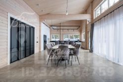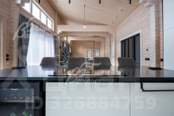 Описание внутренней отделки: в доме выполнена современная отделка в светлых тонах, сочетающая функциональность и эстетику. Стены покрашены. В общих помещениях на полу уложена полуматовая нескользкая плитка размером 8080 см с тёплым водяным полом (для каждого помещения предусмотрен отдельный контур); затирка выполнена с использованием эпоксидно-резиновой смеси швейцарского производства — по три шва; в других помещениях паркетная инженерная доска: в спальнях доска Finex из дуба с интегрированной системой подогрева. Потолки облицованы лиственницей. Смонтирована электрика: фурнитура Werkel в графитовом цвете; по всему дому разведён интернет, полностью проводной. Установлены трубчатые радиаторы в чёрном и белом цвете, белые двери с чёрной алюминиевой окантовкой и чёрной фурнитурой, деревянные подоконники из лиственницы.