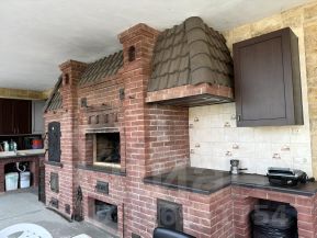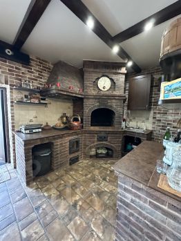 На цокольном этаже расположена гостиная-столовая, в которой имеется каменная печь, мангал, отдельный гостевой санузел, подсобное помещение и цокольная терраса также с каменными печью, мангалом, коптильной и раковиной.