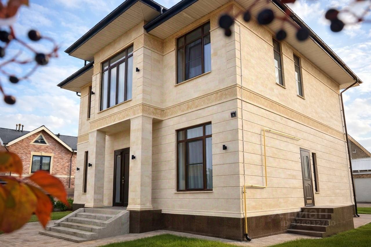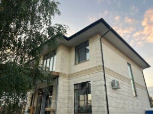 Дом построен в 2020 году для собственного проживания с использованием дорогостоящих материалов: фундамент — свайноростверковый (забивные сваи), перекрытия — плиты ПН/ПНО, стены — тёплая керамика KERAKAM Kaiman, крыша — мягкая черепица Katepal Rocky, окна — профиль VEKA Браво с энергоэффективным остеклением, фасад — дагестанский песчаник с мозаикой и гидрофобной обработкой.