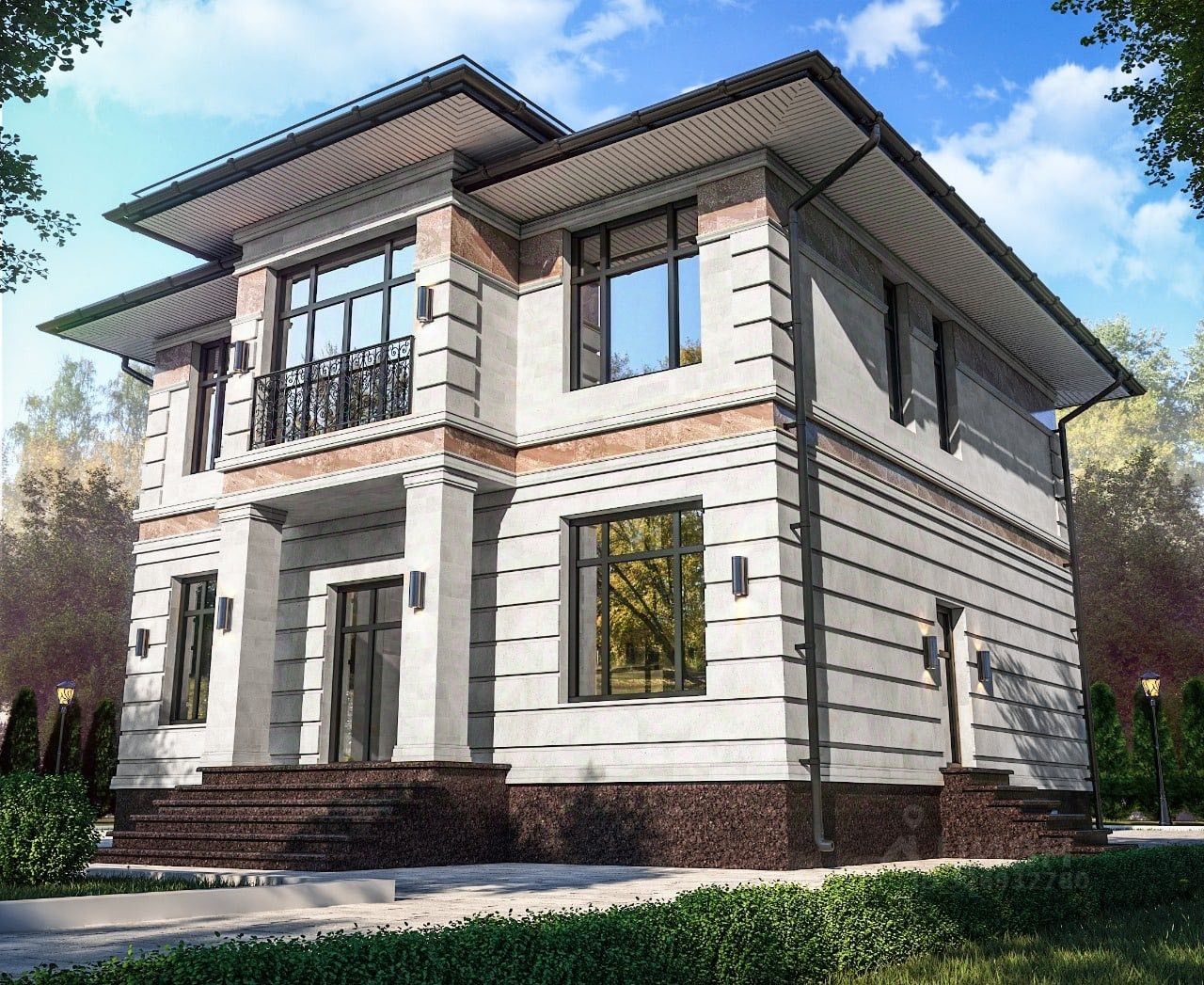 1 этаж: прихожая, гардеробная, большая кухня-гостиная с выходом на веранду, расположена на солнечной стороне, гостевая спальня или кабинет, санузел с сауной и хаммамом, котельная. Высота потолков — 3,3 м.