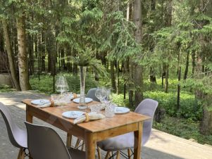 - гостиная с высокими потолками (7 м), вторым светом и панорамными окнами с видом на сосновый лес наполнят пространство воздухом
