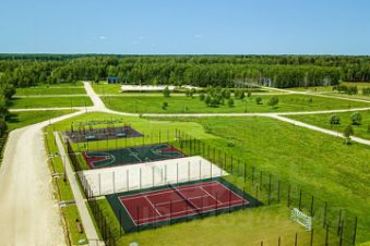 - в поселке предусмотрена дорожная сеть с асфальтовым покрытием, гостевая парковка, многочисленные спортивные локации (площадки для волейбола и футбола, теннисные корты, сквош, уличные тренажеры), игровые площадки для детей