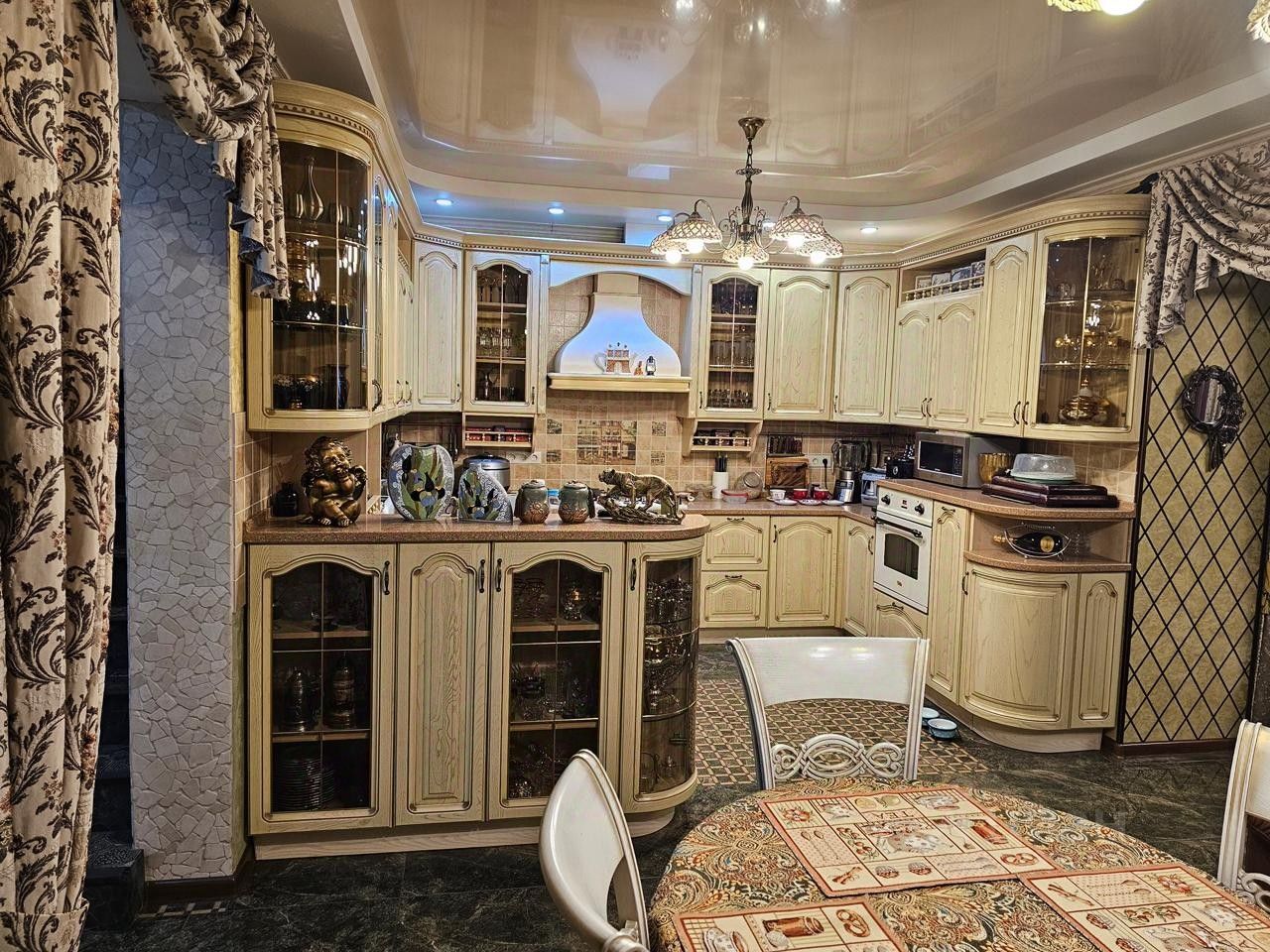 Индивидуальная планировка таунхауса включает: прихожую, бойлерную (газовый котёл De Dietrich), 4 санузла, сауну, гардеробные, кухню, гостиную, 4 спальни, 2 кабинета, балкон. Оснащение включает: интернет по оптоволокну (сеть покрывает всё жилое пространство, роутеры KEENETIK ULTRA), мини-АТС Panasonik KX-TEB 308 (все помещения), кондиционеры DAIKIN, охранная система МИРАЖ-GSM-A4-03. Всё освещение светодиодное. Парковка с навесом на два автомобиля.