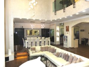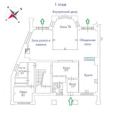 Первый этаж: кухня, обеденная зона, просторная гостиная с зоной просмотра ТВ, камином и роялем, с/у, постирочная, комната для персонала.