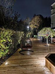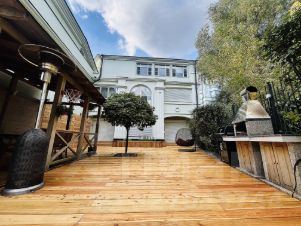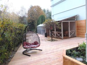 Терраса оборудована зоной барбекю, уличным обогревателем, двухместным гамаком, есть веранда со столом и стульями, и небольшая красивая теплица.