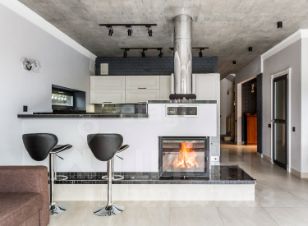 Просторная кухня-гостиная с дровяным камином создает сочетание уюта, живого огня и теплой, гостеприимной атмосферы. По всему первому этажу установлены теплые полы, которые в сочетании с камином создают комфортный климат в доме, особенно в холодное время года.