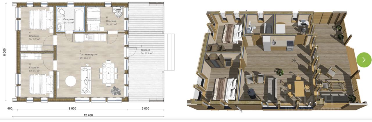 Модульдом 96 (площадь дома 96 кв. м) построен в 2020 году компанией Технология (Rudom). Утепление минватой 200 мм, дом стоит на железных сваях на подготовленной площадке (под домом песок). В доме запроектирована и установлена печь Breneran медленного горения, установлены коммуникации (вода, септик) с греющими кабелями, электрический водный котел, что позволяет проживать в доме круглогодично. В доме немецкая кухонная мебель.
