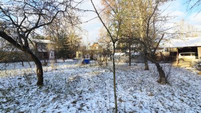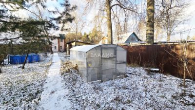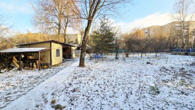 На ровном и сухом участке крытая стоянка для машины и хозяйственный домик. Растут плодовые деревья и кустарники.