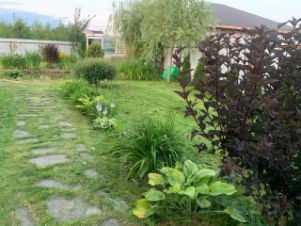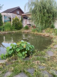 Территория дома- преимущественно газон, из насаждений: цветы, туи, елки, ива кудрявая, слива (плодоносит каждый год), яблони, черешня, малина и много красивой сирени (в том числе желтая сирень, сирень сакура) и декоративные кусты, также на территории дома есть пруд глубиной 1,8 метра(с компрессором для обеспечения кислорода рыбам. В пруду жили карпы (3-5 кг), осетр, форель. Вокруг пруда красиво цветет лилия.