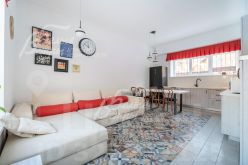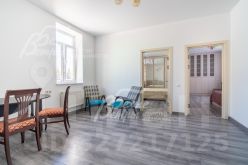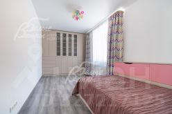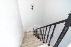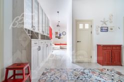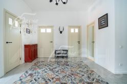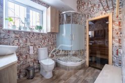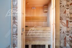 Описание внутренней отделки: в доме выполнена качественная отделка в светлых тонах в современном стиле: стены окрашены, в санузлах — итальянская плитка, на полу — итальянский керамогранит и ламинат, потолки — подвесные из гипсокартона, предусмотрены тёплые полы под плиткой и в санузлах. Установлены стальные панельные радиаторы, выключатели и розетки Legrand, эмалированные двери. На первом этаже есть сауна с электрической печью и отделкой из абаша. На второй этаж ведёт лестница на бетонном основании со ступенями, отделанными испанским керамогранитом.